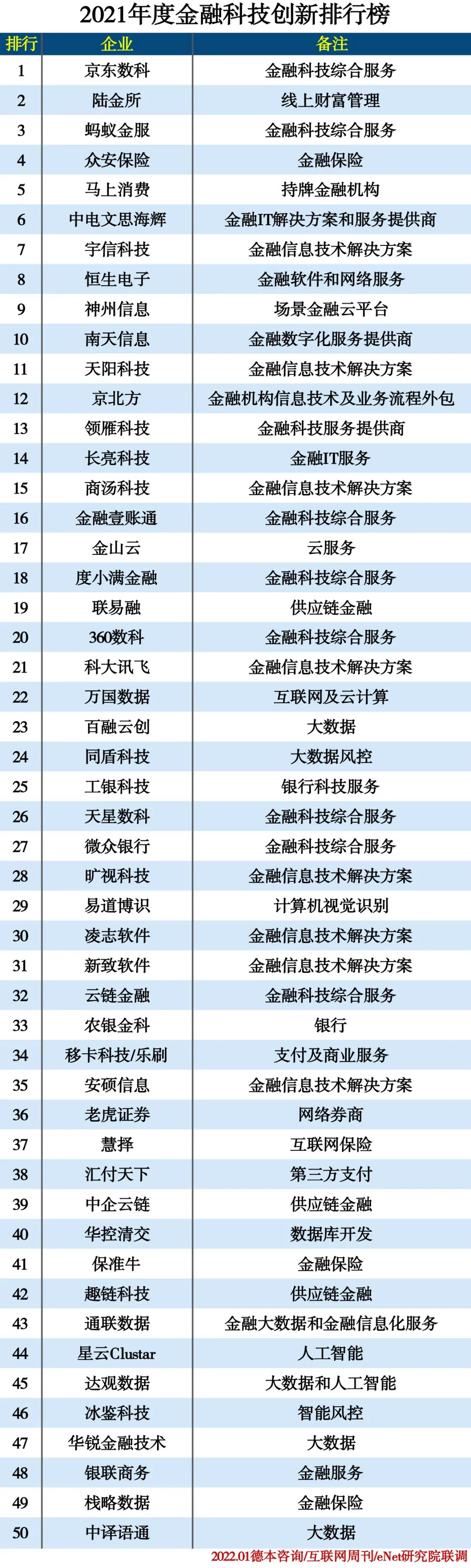 在2022年互聯網周刊、德本咨詢和eNet研究院聯合發布的2021年度金融科技創新排行榜中,易道博識憑借本身的核心技術能力、行業解決方案價值及技術創新程度入榜,位列第29名。