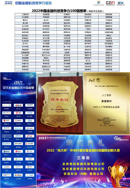 在此期間,易道博識不僅連續(xù)數(shù)年獲得中關村金融科技30強、中國金融科技競爭力100強、中關村論壇國際技術交易大會-百項新技術新產品、中國互聯(lián)網(wǎng)經(jīng)濟論壇-人工智能領航企業(yè)金i獎等,更多次入圍各專業(yè)領域聯(lián)盟、協(xié)會、媒體評選的人工智能、金融科技等相關榜單、獎項和優(yōu)秀案例等。