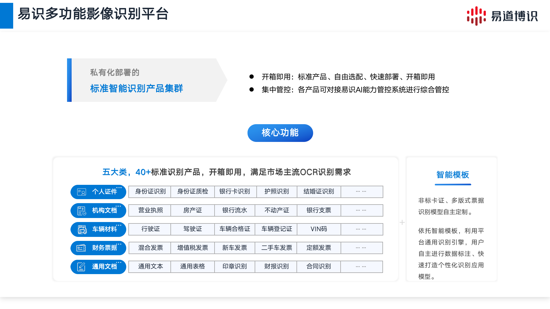 易識多功能影像識別平臺是一款基于深度學習技術開發、私有化部署的標準智能識別產品集群,可滿足卡證識別、票據識別、文檔識別等50余種市場主流OCR需求。憑借具有自主知識產權的核心算法,易識多功能影像識別平臺可準確、快速識別復雜背景中的印刷文字、手寫文字、印章、表格等多形式文本內容。