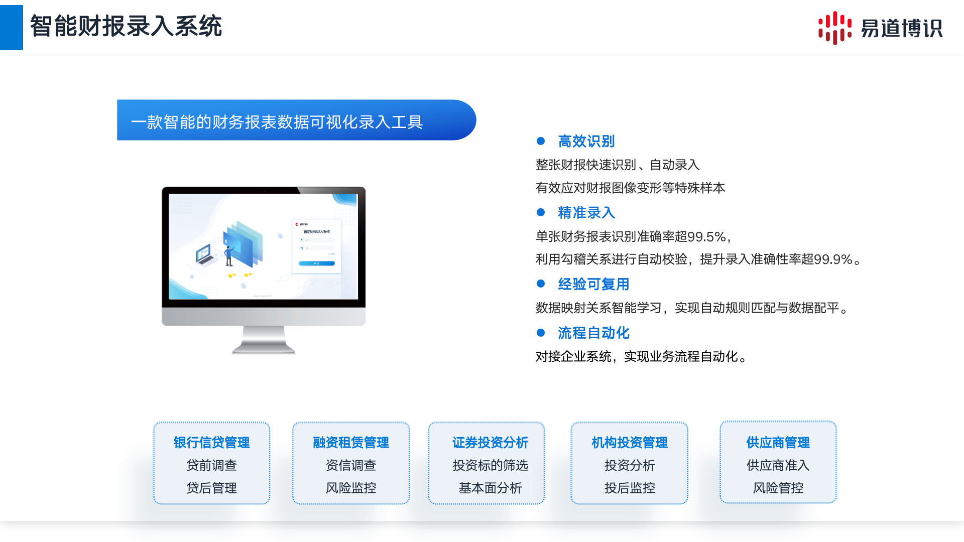 智能財報錄入系統是一款智能的財務報表數據可視化錄入工具,支持整張財報快速識別、自動錄入,能有效應對財報圖像變形等特殊情況,在規范樣本下單張財務報表識別準確率平均超過99.5%,利用勾稽關系進行自動校驗,錄入準確性超99.9%。系統可直接對接企業系統,實現業務流程自動化。